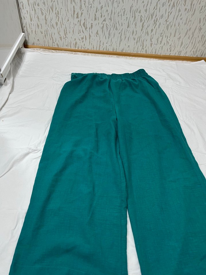 Kadın keten kumaştan yapılmış, rahat kesim ve midi boy, koyu yeşil renkte pantolon. Günlük kullanım için zahmetsiz şıklık sunar.