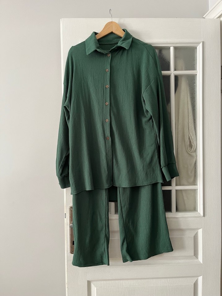 Kadın yeşil takım, rahat kesim ve uzun boy. Uzun kollu, düğmeli ve yakalı, günlük kullanıma uygundır.