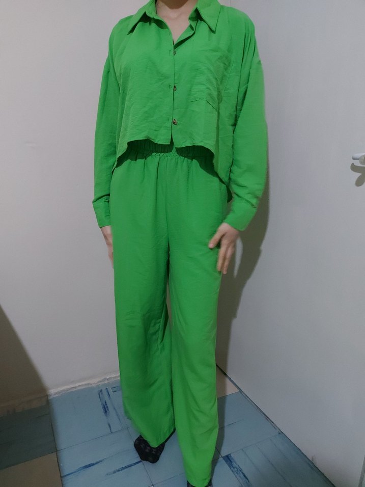 Kadınlar için yeşil keten kumaştan, düğmeli, uzun kollu, normal boy midi rahat kesim tulum. Günlük kullanıma uygundur.