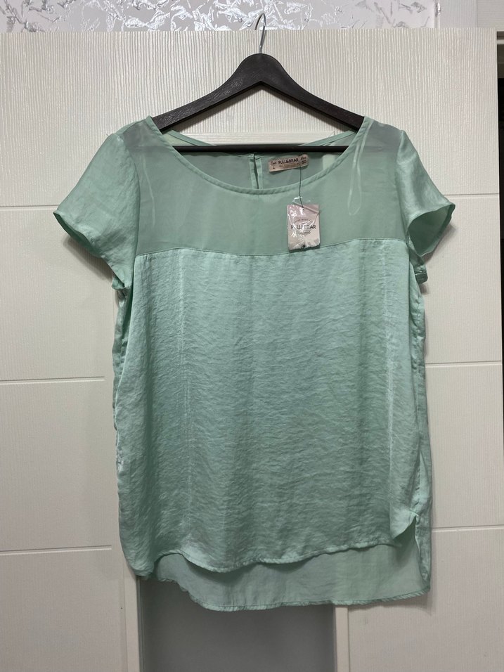 Kadınlar için kısa kollu, yuvarlak yaka ve saten kumaştan yapılmış, rahat kesimli, normal boyda yeşil bluz. Günlük sokak stili için uygundur.