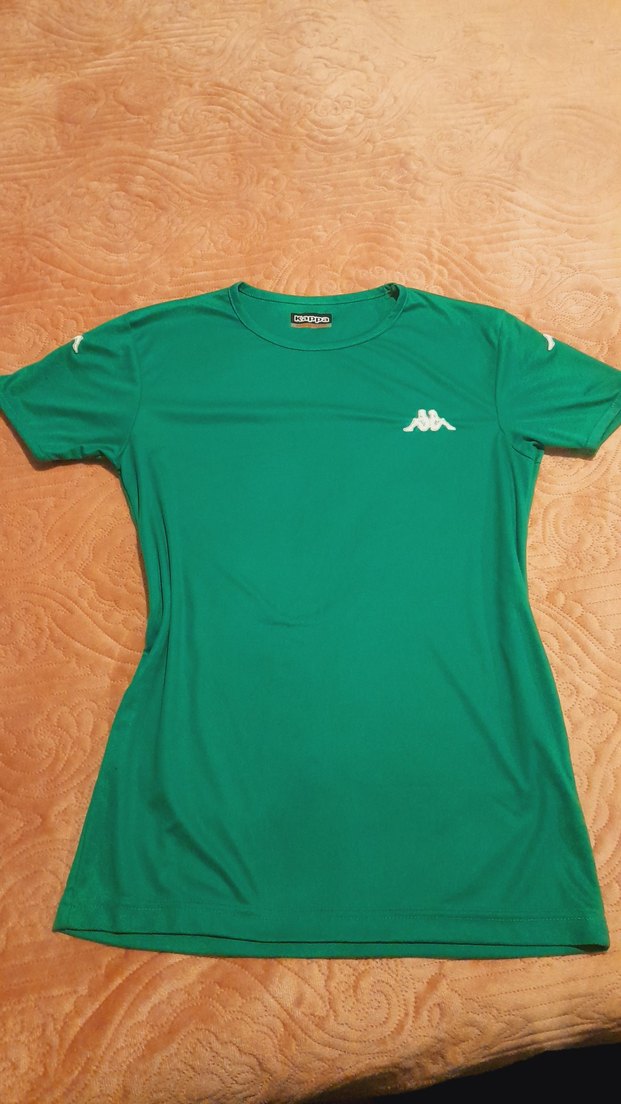 Kısa kollu, yuvarlak yakalı, yeşil parlak renkte, yumuşak ve sıcak kumaştan üretilmiş kadın spor tişörtü. Baskılı logo ve cırt cırt detayına sahiptir. ♀️
