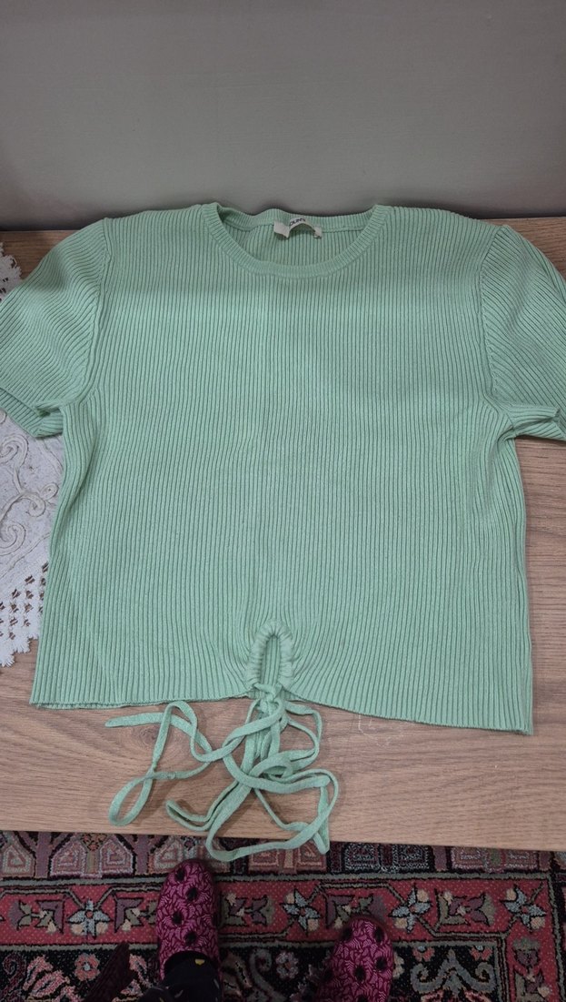 Kısa kollu, yuvarlak yakalı, yeşil triko tişört, kısa boy ve bel kısmında bağcıklı detay ile casual sokak stiline uygun.