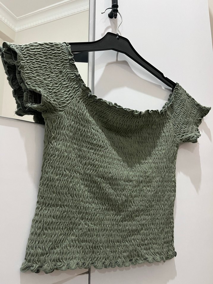 Kadınlar için yeşil, kısa boylu, örgü dokulu, kayık yaka ve kısa kollu, pamuksu keten kumaştan yapılmış dar kesim bluz. Günlük kullanıma uygundur.