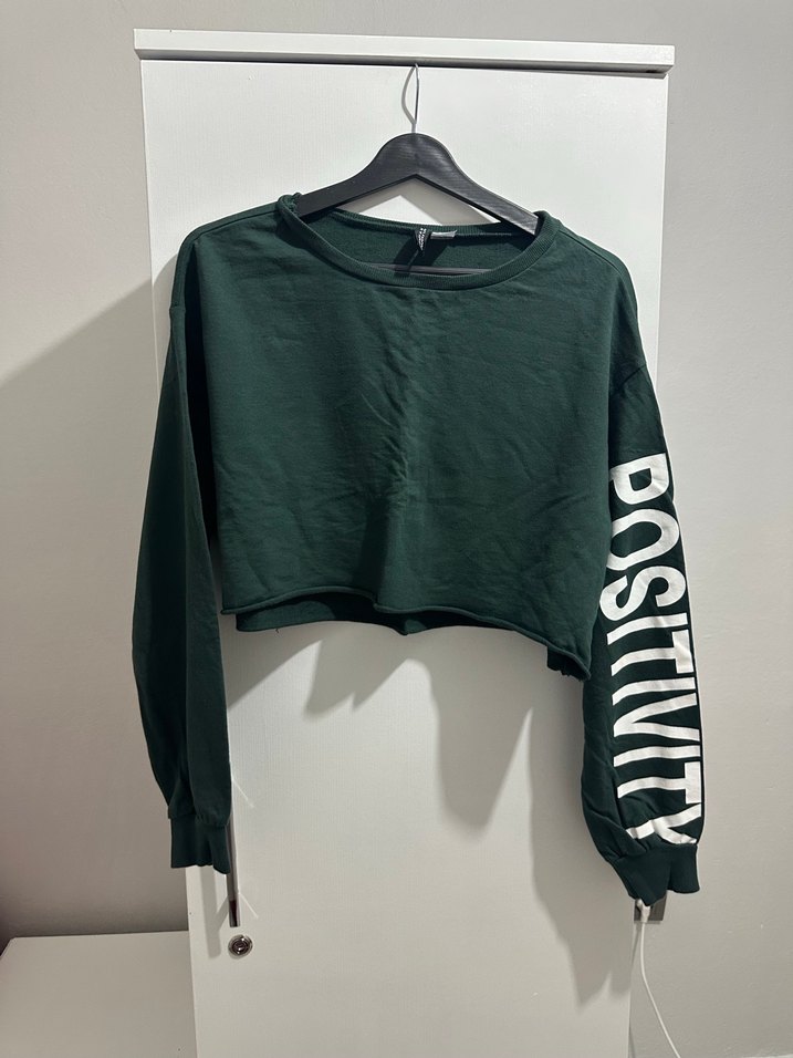 Uzun kollu, yuvarlak yaka, koyu yeşil pamuklu sweatshirt. Salaş, kısa kesim ve kolunda 'POSITIVITY' baskısı bulunur. Rahat ve şık günlük kullanım için.