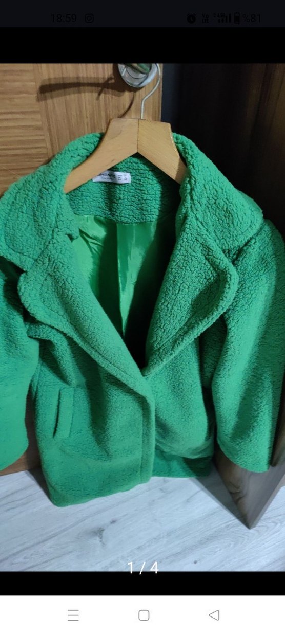 Parlak yeşil renkte, yumuşak kürk detaylı, kısa ve bol kesim kadın kaban. Uzun kollu, yakası notched lapel tarzında, rahat sokak giyimi için uygun.duz altında