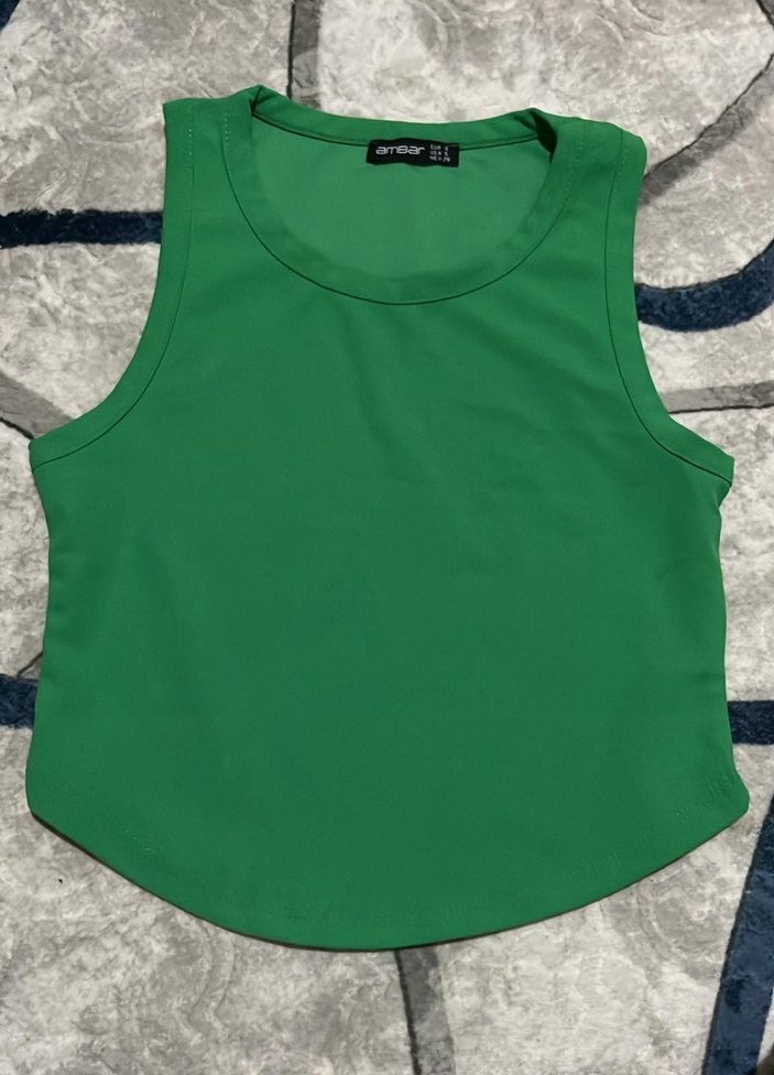 Deri hissi veren yeşil kolsuz, yuvarlak yakalı, dar kesim atlet. Şık ve rahat dış mekan kullanımı için uygun.