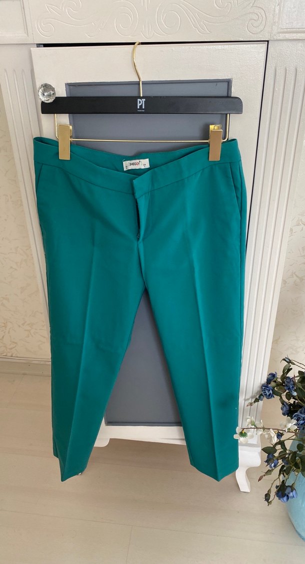 Kadınlar için yeşil kumaş pantolon, regular fit ve midi boyda. Parlak sentetik kumaştan kemerli, ofis ve sokak stiline uygun.