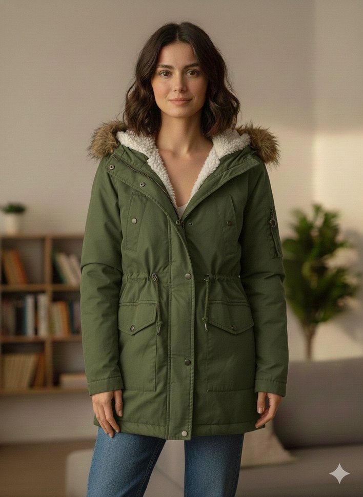 Kadınlar için yeşil, kürk detaylı kapüşonlu parka. Regular fit, uzun kollu, yumuşak ve sıcak tutan fleece kumaştan üretilmiştir. Trendy ve rahat sokak stili için uygun.İki kol arası 54 cm boyu 78 cm
