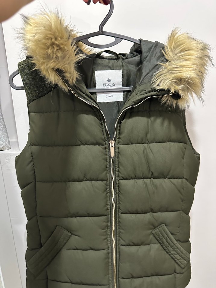 Kadınlar için kürklü kapüşonlu, kollu olmayan, sentetik kumaştan yapılmış yeşil kamuflaj desenli şişme yelek. Sokak stiline uygun ve dış mekan kullanımı için rahat.