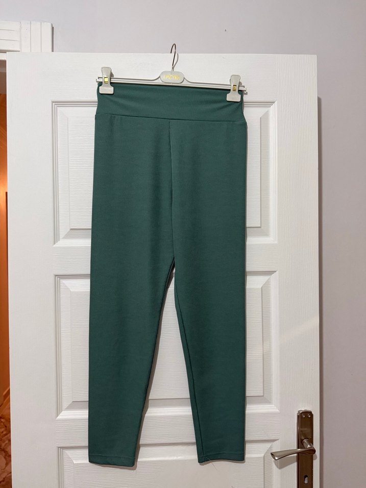 Kadın yeşil tayt, regular fit ve uzun boy. Sentetik kumaştan, kuşaklı, sokak stili için uygun, günlük kullanımda rahat.