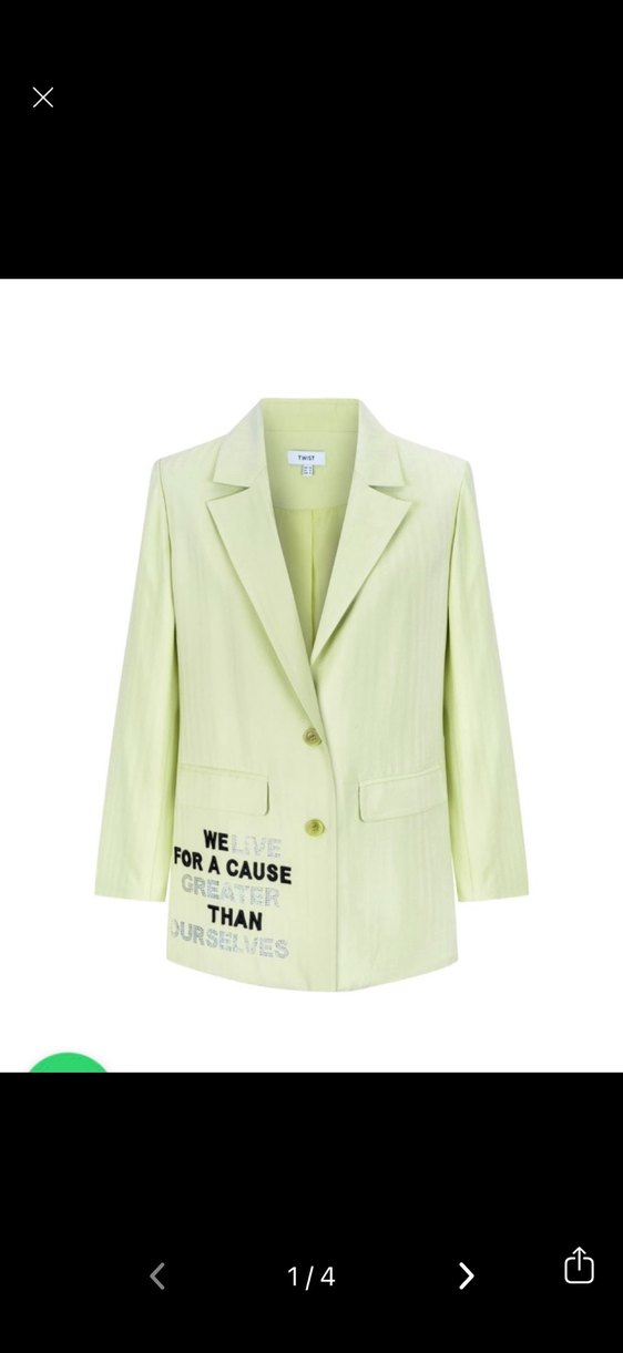 Düğmeli, normal midi boyda, uzun kollu ve yeşil renkte kadın blazer. Yumuşak sentetik kumaştan, iş ortamı için uygun, cep kısmında yazılı detaylı.