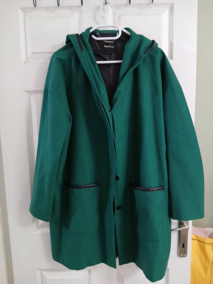 Kadın yeşil renkli, kapüşonlu midi kaban. Uzun kollu, rahat kesim ve fermuarlı ceplere sahip. Günlük kullanıma uygun, sıcak ve konforlu kumaş.uzunluk 88 cm