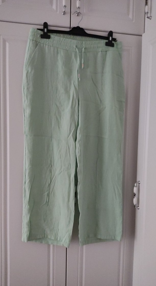 Midi boy, keten kumaştan, rahat kesim ve lastikli bel özellikli yeşil pantolon. Günlük kullanıma uygun, minimal ve şık bir parça.