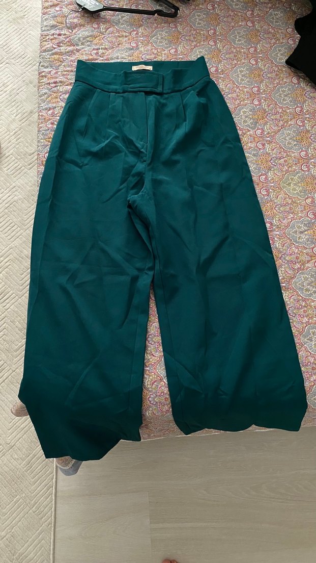 Koyu yeşil, bol kesim, midi boy, drapeli kumaş pantolon. Ofis için uygun, minimal tarzda rahat bir model.