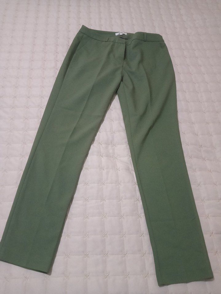 Kadın yeşil midi pantolon, regular fit ve düz kumaştan, iş ortamı için sade ve zahmetsiz şıklık sunar.