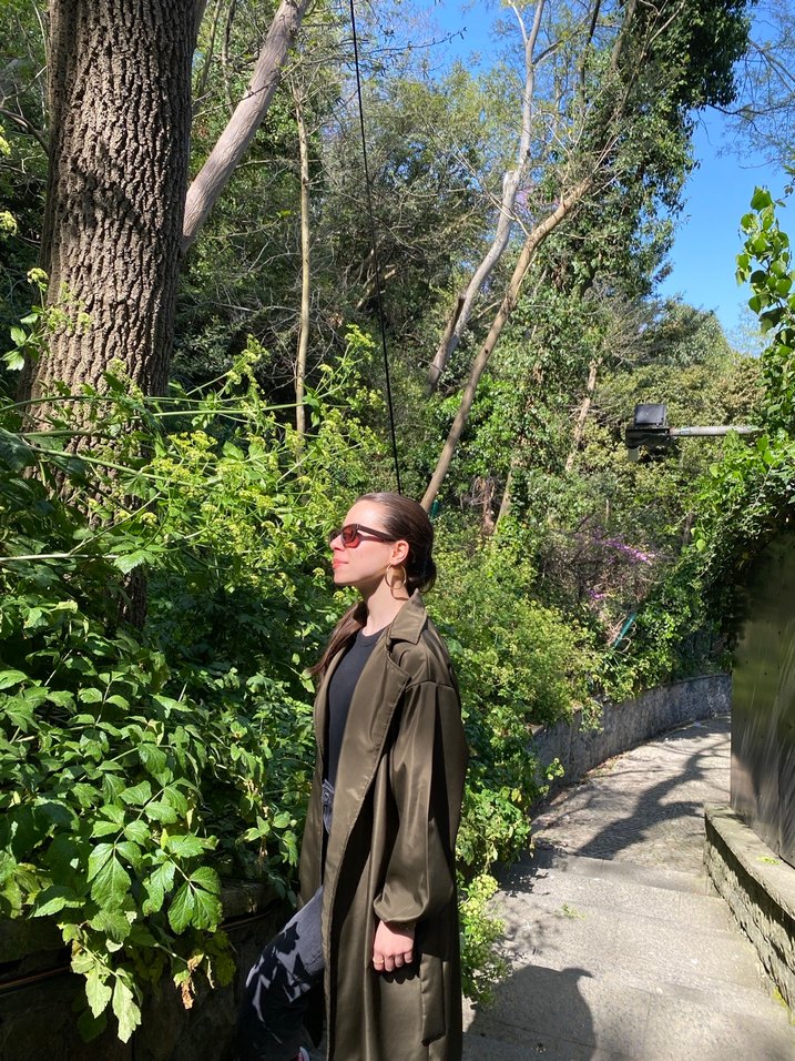 Giyildi ama bir problemi yok  temiz standart kalıp koyu yeşil trenckot.
