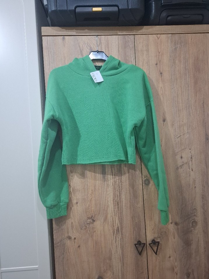 Kadın sweatshirt, uzun kollu, yuvarlak yakalı, bol kesim ve pastel yeşil renkte. Yumuşak, sıcak triko kumaştan kısa boyda, rahat sokak stili için uygun.