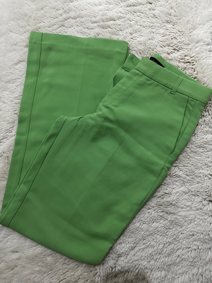 Kadın yeşil kumaş pantolon, normal boy ve regular fit. Parlak dokusu, minimalist normcore tarzıyla ofis için uygun. HİÇ GİYMEDİM