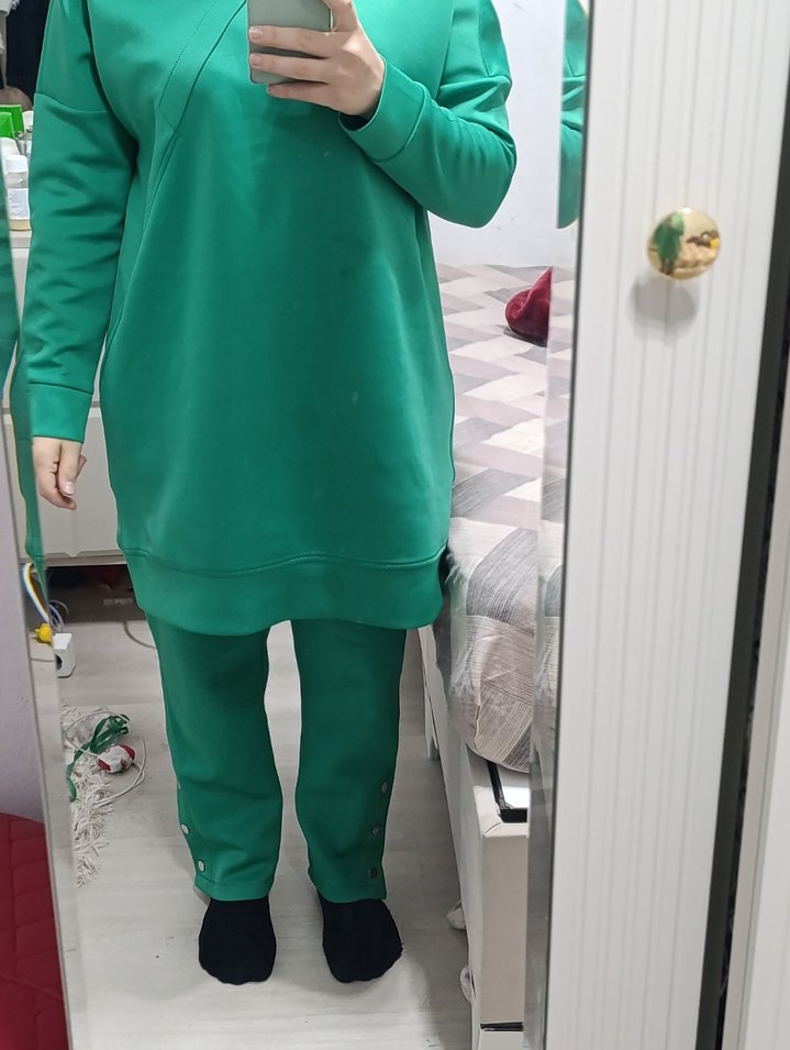 Kadın eşofman takımı, rahat kesim, yuvarlak yaka ve uzun kolludur. Yumuşak ve sıcak kumaştan, günlük kullanım için koyu yeşil renkte, zahmetsiz şıklık sunar. ♀️