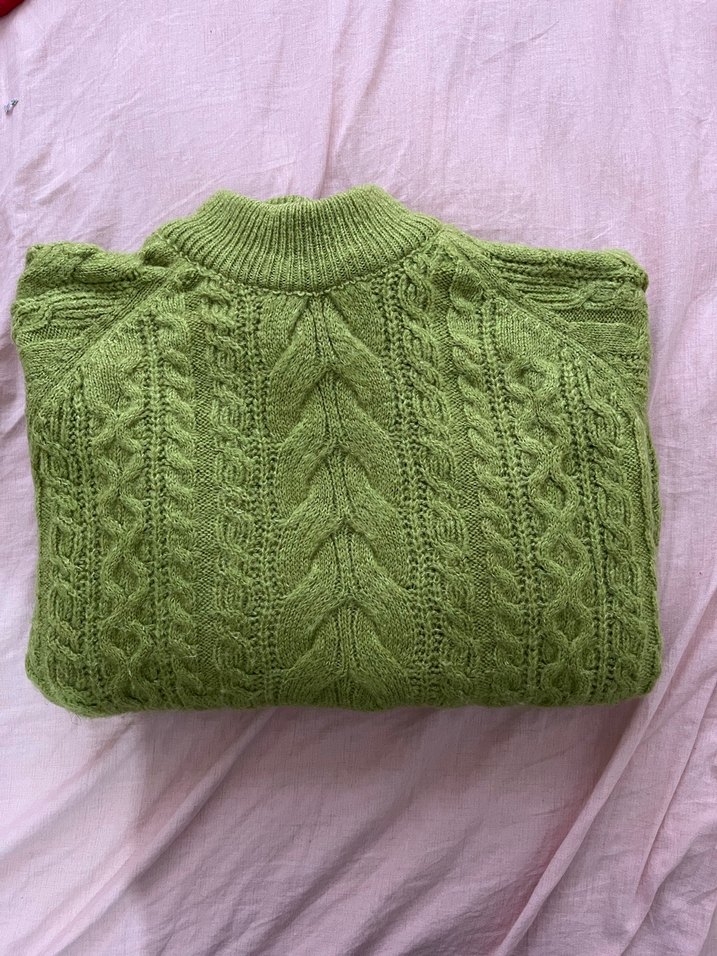 Kadınlar için örgü dokulu, boğazlı ve uzun kollu kazak. Gevşek kesim, normal midi boyda, pastel yeşil renkte, günlük kullanıma uygun.
