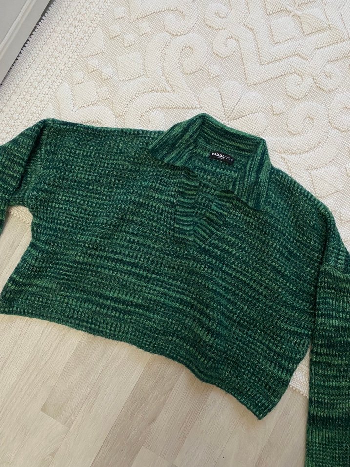 Bu koyu yeşil örgü kazak, yakalı ve uzun kollu olup, rahat kesimiyle günlük kullanım için bohem tarz sunar.