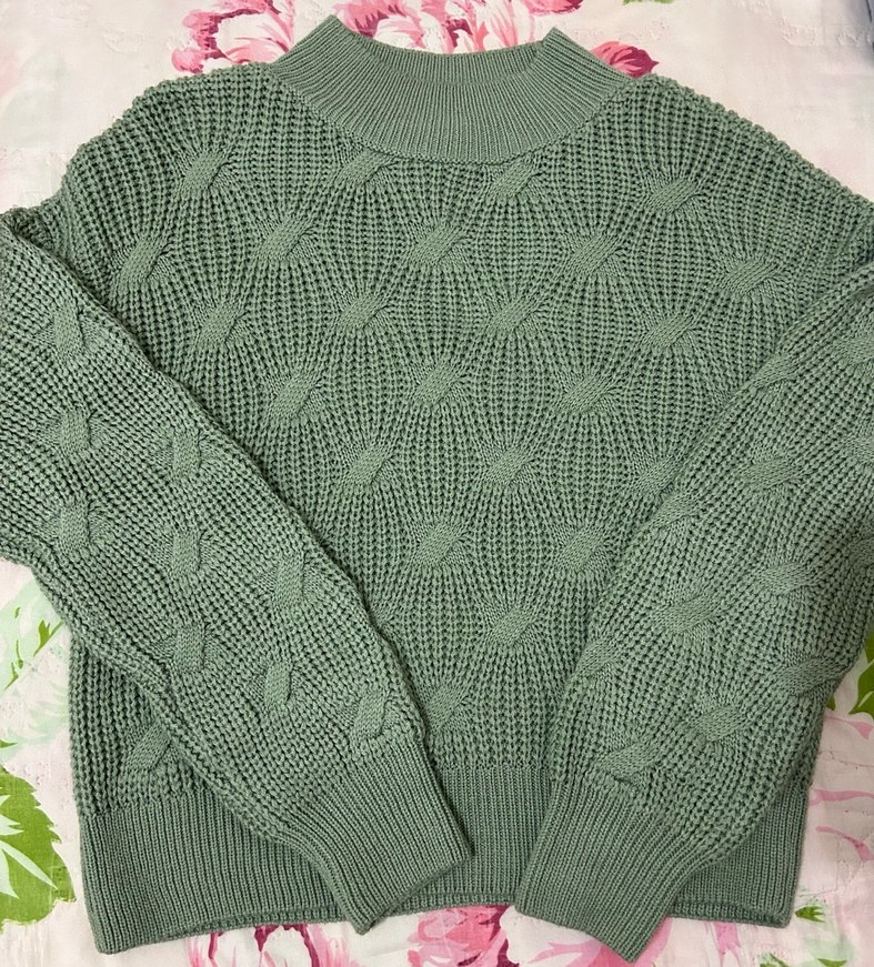 Yeşil renkli, örgü dokulu, bohem tarzda, yuvarlak yakalı ve uzun kollu, rahat kesim kadın kazak.