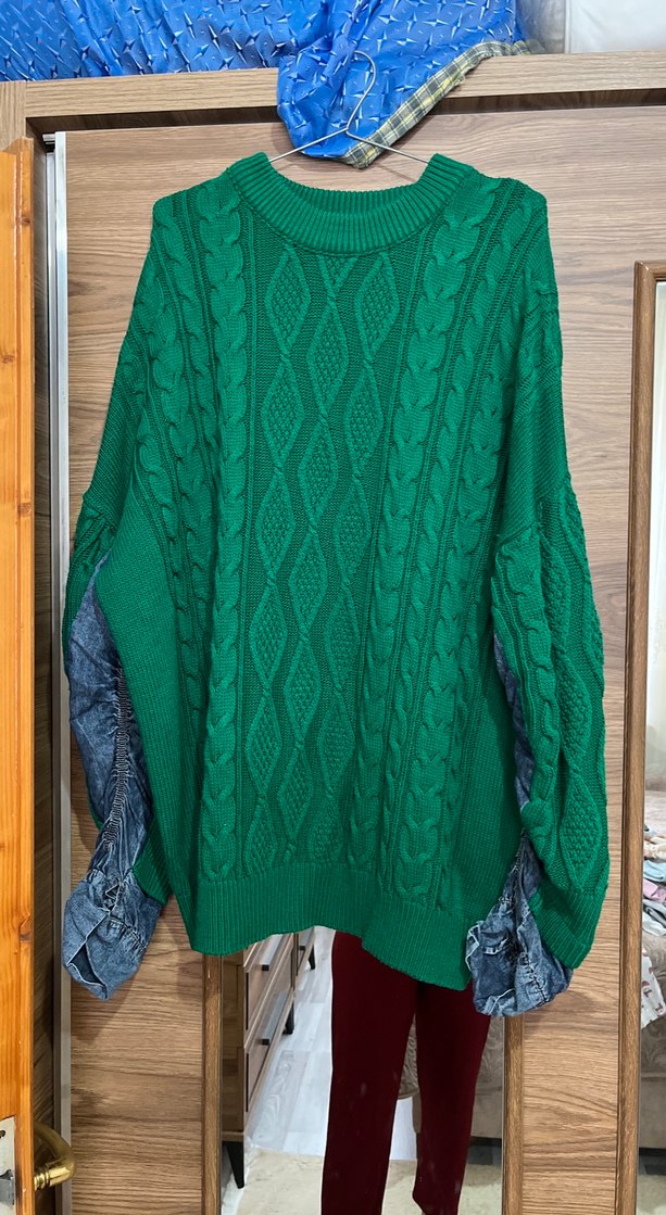 Bu koyu yeşil örgü kazak, uzun kollu, yuvarlak yakalı ve salaş kesimdir. Normal midi boyda ve rahat örme kumaştan günlük kullanıma uygundur.