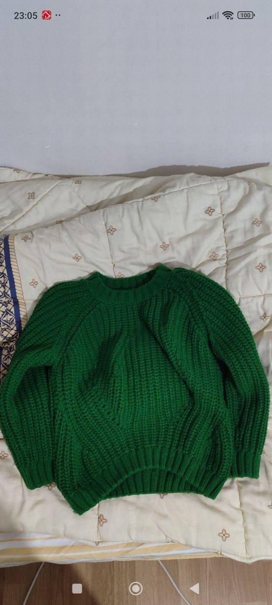 Yeşil renkli, örgü kumaştan yapılmış, yuvarlak yakalı ve uzun kollu, salaş kesim normal boyda kazak. hiçbir defosu yoktur temzdir.