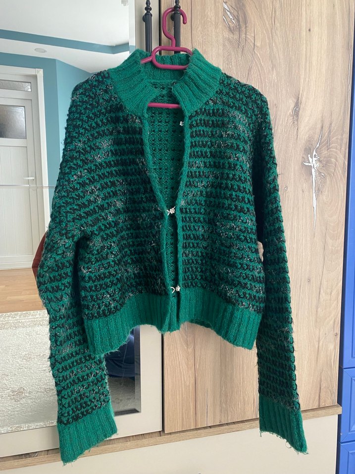 Bu koyu yeşil örgü triko hırka, bol kesim, uzun kollu ve boğazlıdır. Normal midi boyda, sade ve rahat kullanıma uygundur.