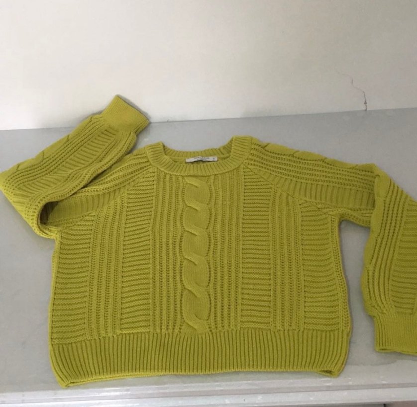 Bu yeşil örgü triko kazak, yuvarlak yaka ve uzun kollu, bol kesimiyle günlük kullanım için rahat ve şık bir seçenek sunar.