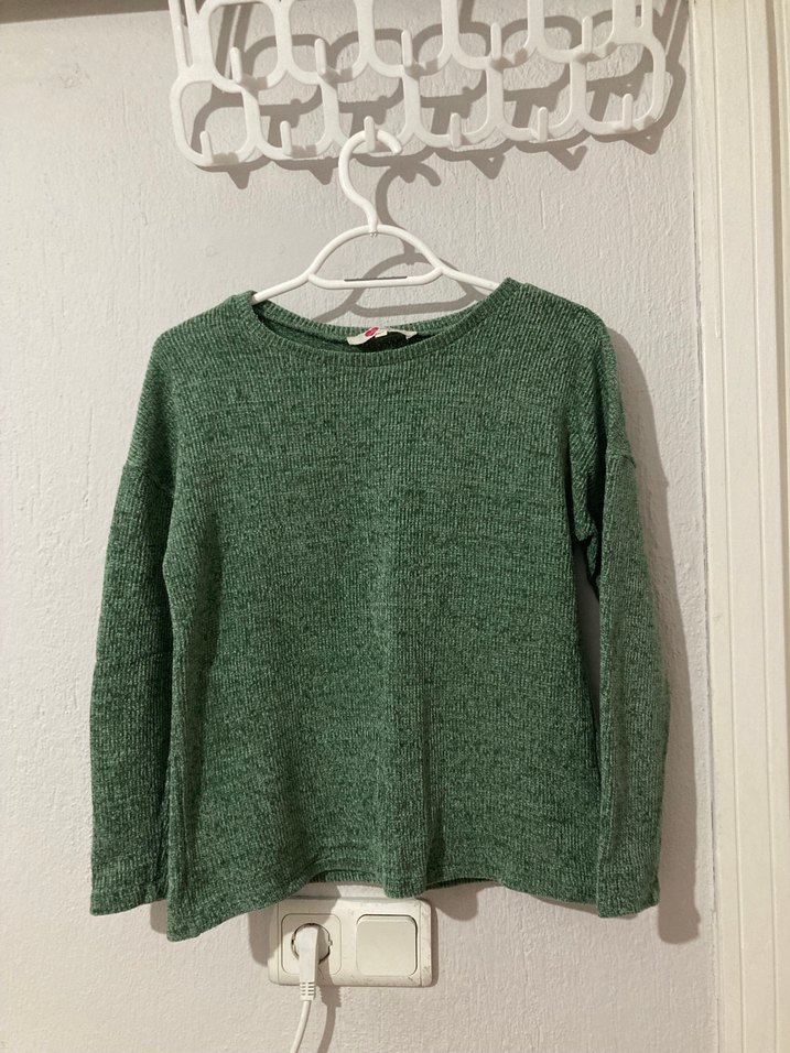 Yeşil renkli, uzun kollu, yuvarlak yaka örgü yün kadın kazak. Rahat kesim ve normal uzunluktadır, günlük kullanıma uygundur.
