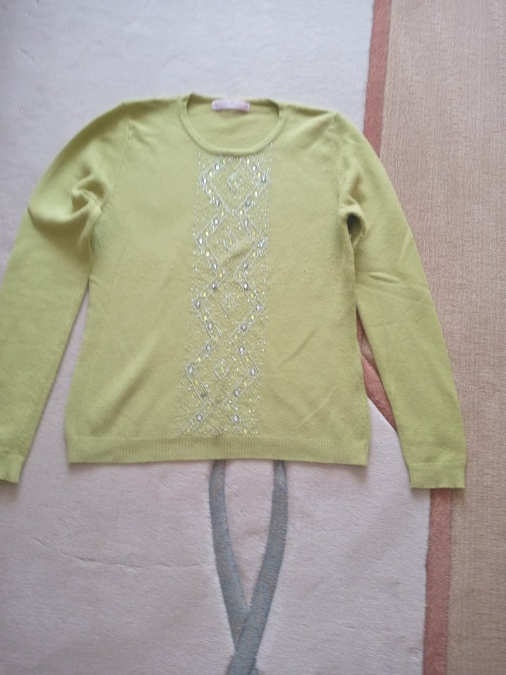 Kadınlar için yuvarlak yaka, uzun kollu, gevşek kesim örme kazak. Pastel yeşil renkte, ön kısmında dekoratif detaylar bulunur. Günlük kullanıma uygundur.