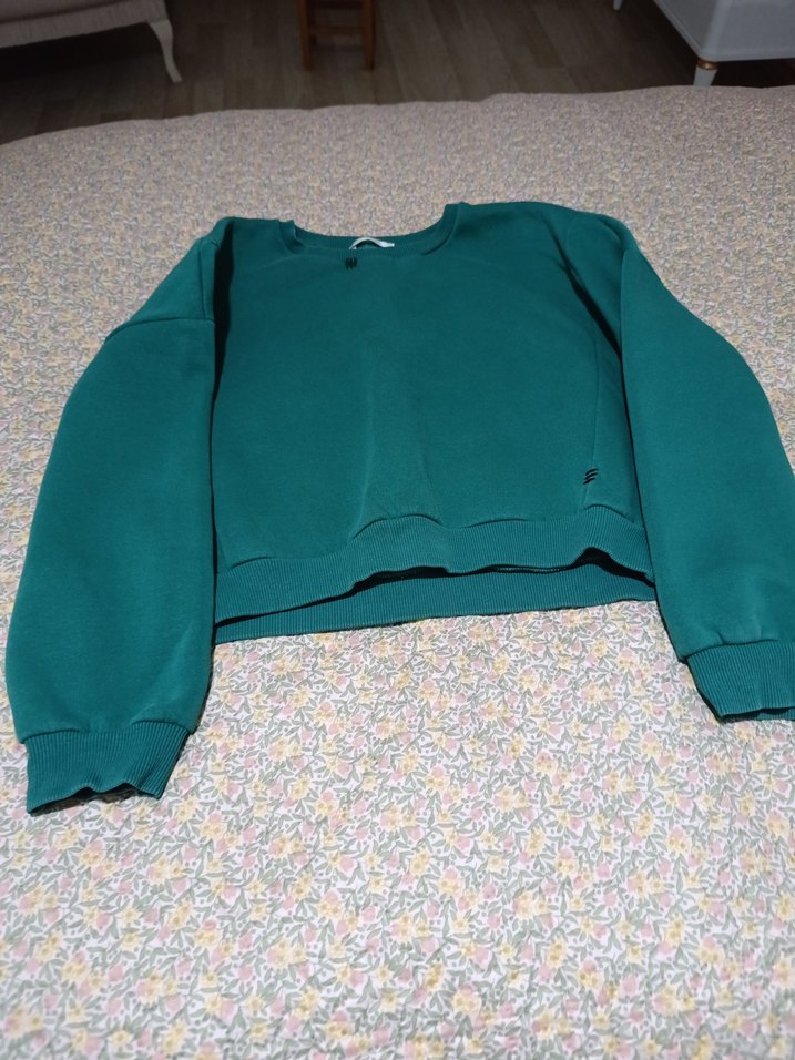 Kadın sweatshirt, yuvarlak yaka, uzun kollu ve oversize kesimlidir. Yumuşak fleece kumaştan, koyu yeşil renkte ve midi boydadır. Rahat sokak stili için uygundur.