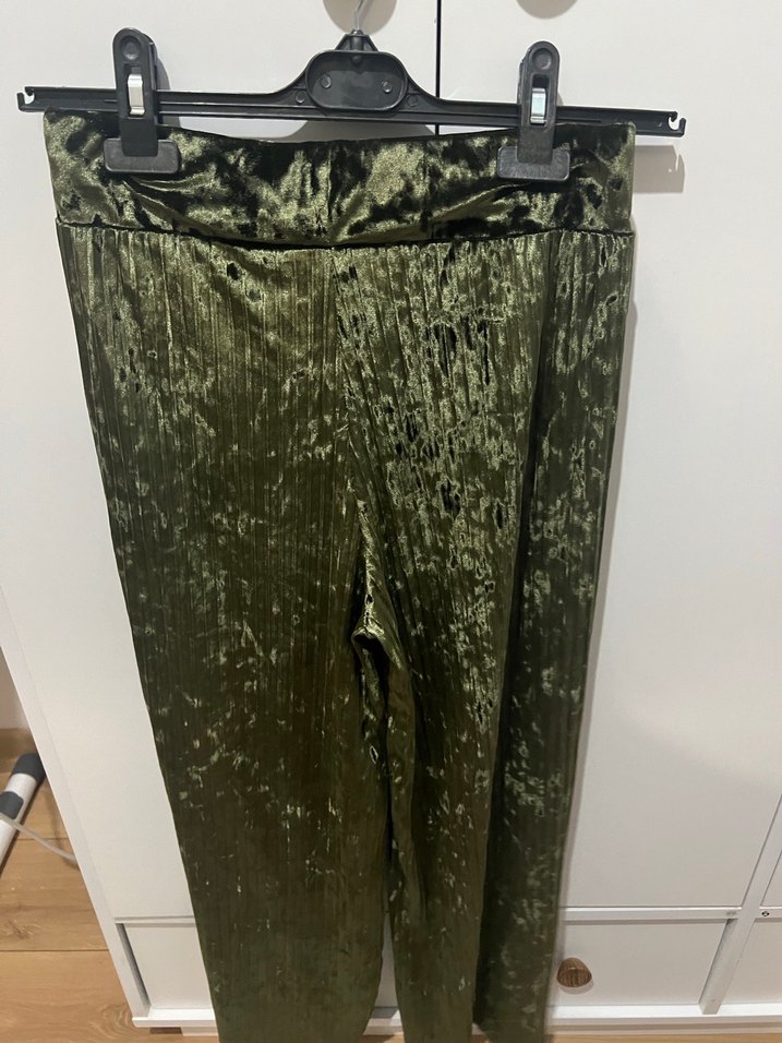 Yeşil parlak sentetik kumaştan, piliseli ve bol kesim midi uzunluğunda kadın pantolonu. Sokak stili ve dış mekan kullanımı için uygundur.