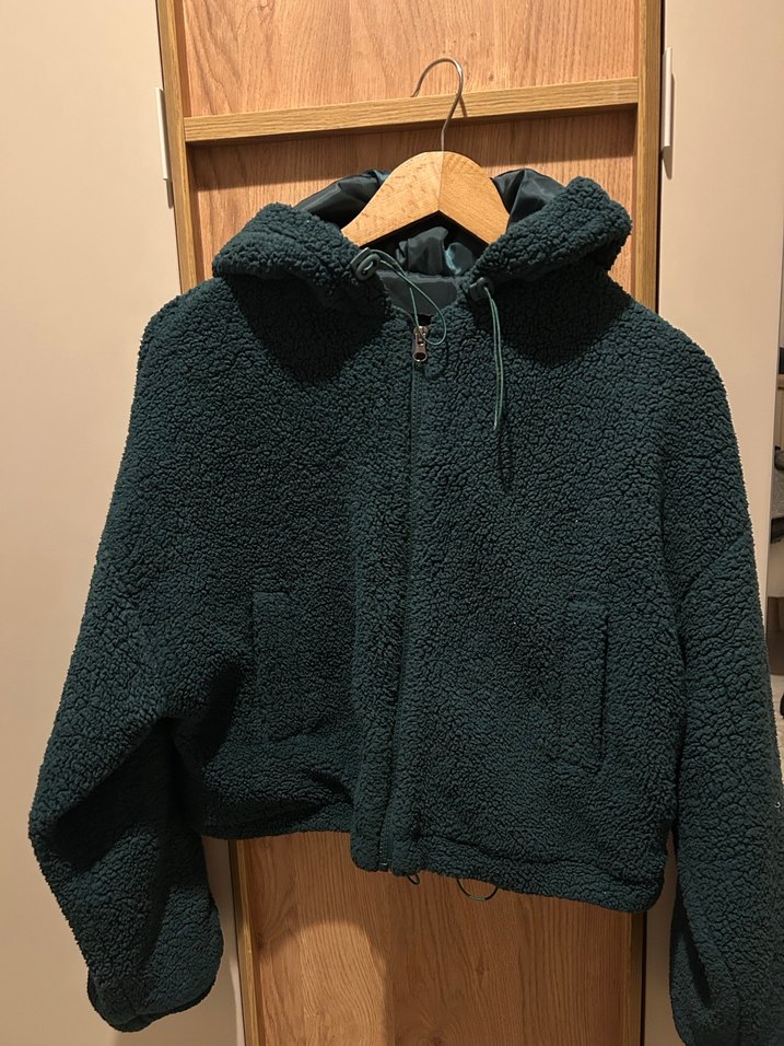 Kadınlar için koyu yeşil renkte, bol kesim ve uzun kollu, yuvarlak yakalı peluş kumaştan yapılmış, kürk detaylı rahat ve günlük sokak tarzı ceket.
