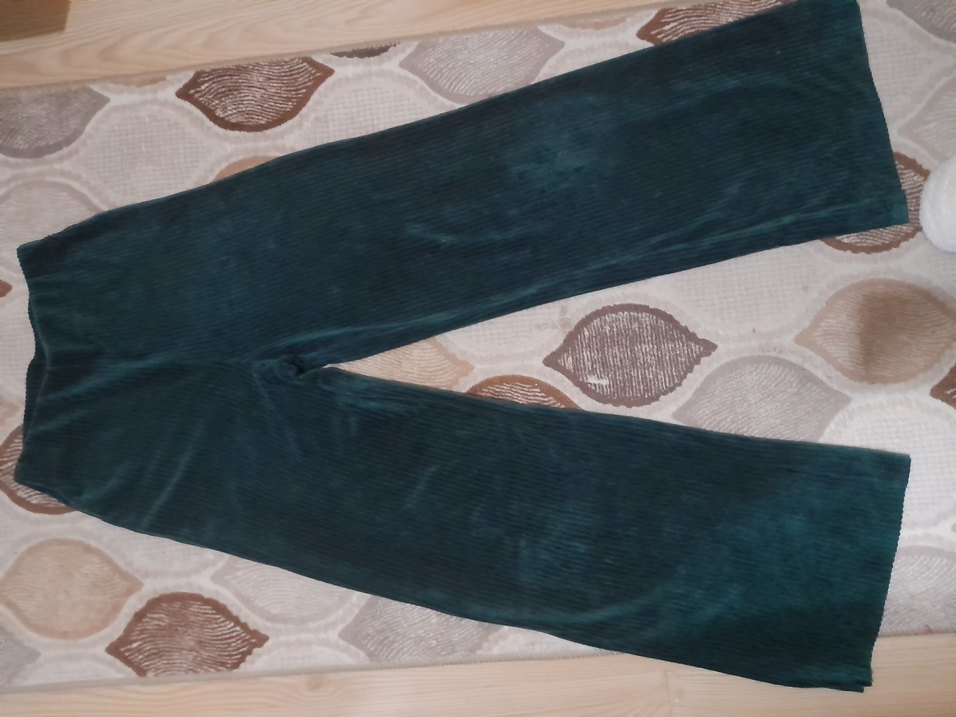 Yumuşak sentetik kumaştan yapılmış koyu yeşil pileli kadın pantolonu. Uzun, regular fit ve bohem tarzıyla rahat günlük kullanıma uygundur.