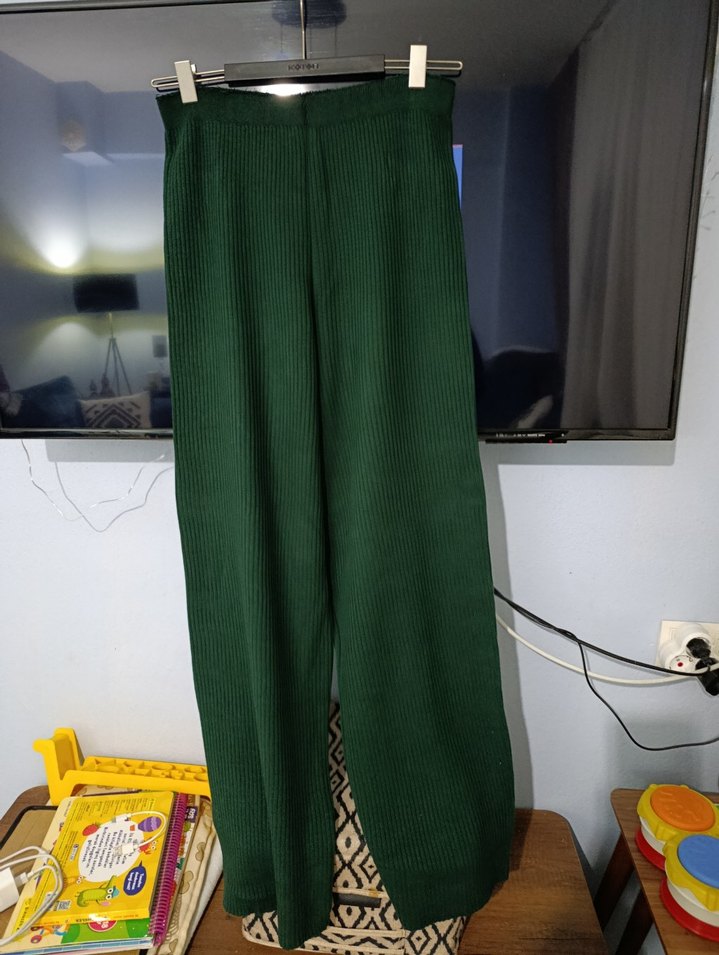 Uzun, geniş paça pilili kadın pantolonları, koyu yeşil renkte, yumuşak sentetik kumaştan rahat ve gündelik bir görünüm sunar. tiriko ürünüdür hiç giyilmedi boyu çok uzun geldi iade edemedim alıcıya hayırlı olsun❤️