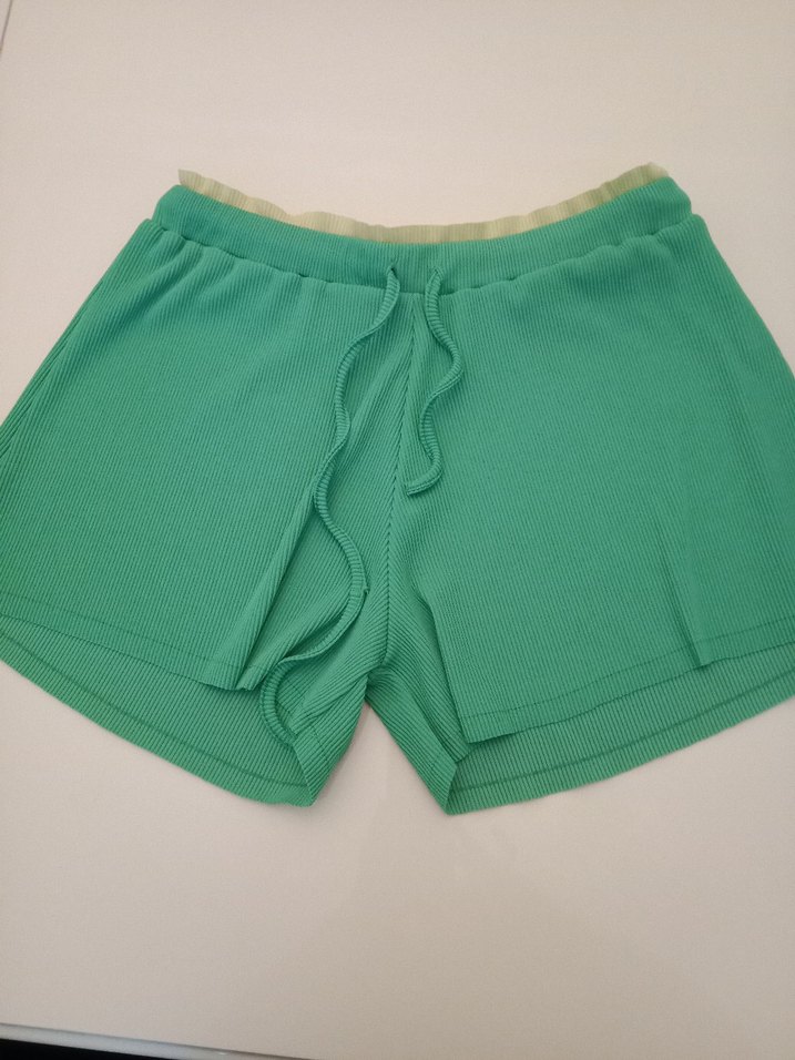 Sentetik kumaştan yapılmış, pilili ve pastel tonlarda, bol kesim yeşil mini şort. Dış mekan sokak stili için uygundur.