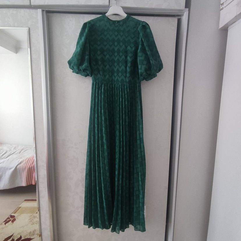 Kadınlar için yeşil renkte, pilili detaylara sahip uzun elbise. Sentetik kumaştan, bol kesim, yuvarlak yaka ve askılı kollu, modern klasik ve vintage tarzı yansıtıyor.