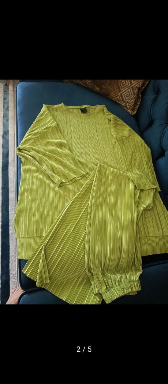 Kadınlar için uzun kesim ve bol fitli, pilili detaylara sahip keten takım. Parlak yeşil renkte, yuvarlak yaka ve uzun kolludur. Günlük kullanıma uygundur.