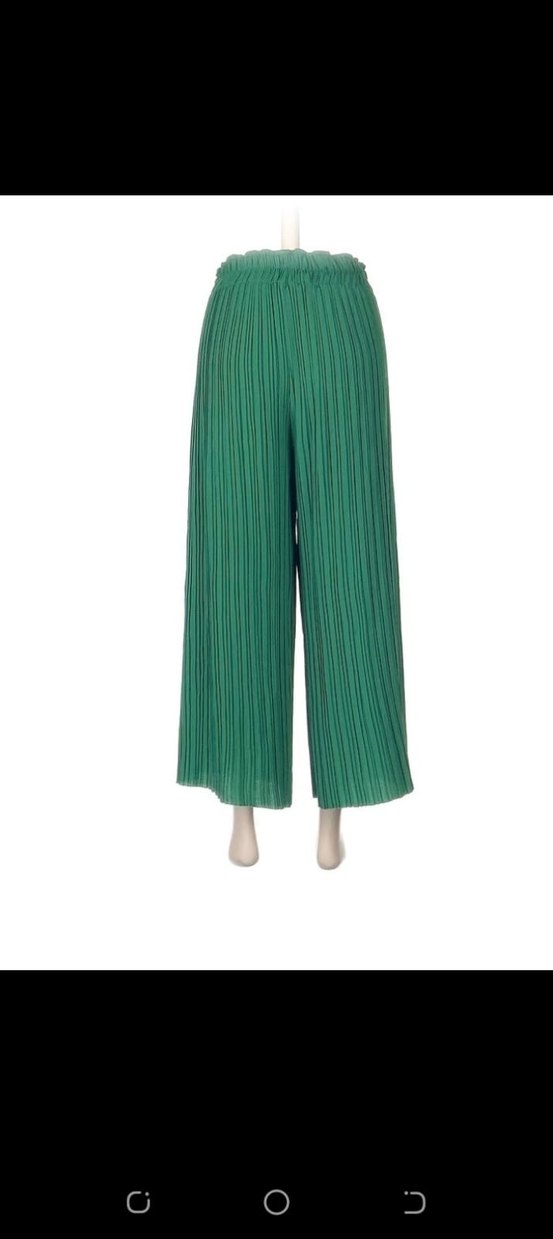 Yeşil renkli, piliseli ve bol kesim uzun kadın pantolonu, yumuşak sentetik kumaştan üretilmiştir.