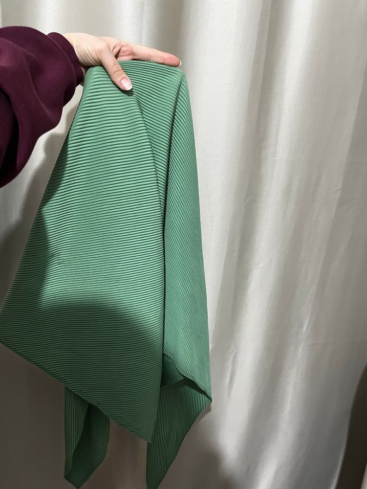 Sentetik kumaştan yapılmış, hafif yeşil piliseli kadın sargı eteği, minimalist sokak modasına uygun.