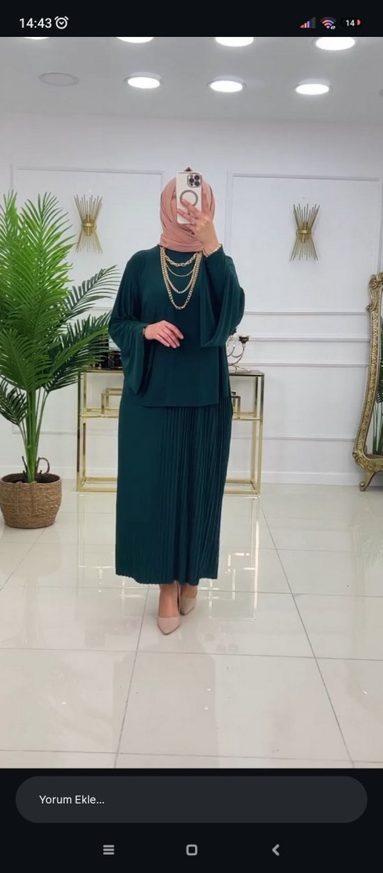 Kadınlar için yüksek yakalı, uzun kollu, bol kesim piliseli uzun elbise. İpek gibi kumaştan, koyu yeşil renkte, minimalist ve sade tarz için uygundur. SIFIR ÜRÜN ASIL RENGİ GRİ FOTOĞRAF BULAMADIĞIM İÇİN YEŞİL RENGİ KOYDUM Etek üst takım