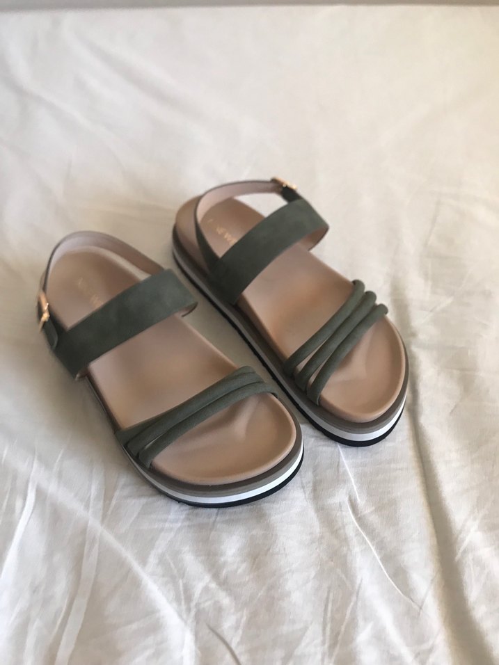 Yeşil renkli, tokalı kayışlara ve kauçuk tabana sahip platform topuklu kadın sandaletleri. Minimalist ve çağdaş tarzda, günlük kullanım için uygundur.