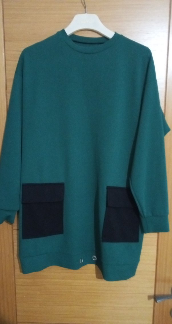 Uzun kollu, yeşil rahat triko sweatshirt. Bisiklet yaka, iki ön cepli ve normal boyda, günlük kullanıma uygun.
