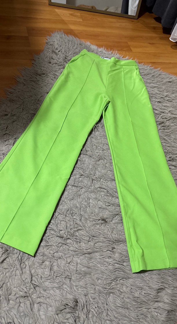 Canlı yeşil renkte, regular fit ve uzun paçalı kadın kumaş pantolon. Düz, sentetik dokulu kumaştan, fermuarlı detaylı, dış mekan rahatlığı için uygun.