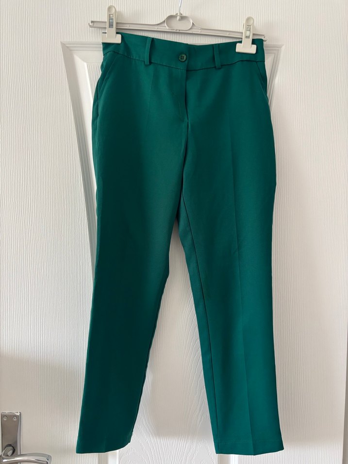 Kadınlar için regular fit ve midi boyda, koyu yeşil renkte kumaş pantolon. Sentetik kumaştan üretilmiş, sade tasarımlı, ofis ve günlük kullanıma uygun, zahmetsiz şıklık sunar.