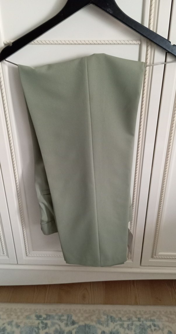 Kadınlar için regular fit, uzun yeşil renkli sentetik kumaştan fermuarlı kumaş pantolon. Minimalist ve desensiz ofis stiline uygundur. 48 beden yeni etiketli