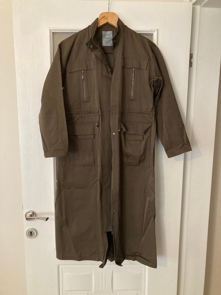 Yeşil, beli ayarlanabilir lastikli ve bol kesim uzun trençkot/parka, yakası kesik ve uzun kolludur, günlük kullanıma uygundur.