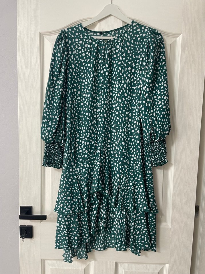 Yeşil renkli midi boy, uzun kollu, yuvarlak yaka ve salaş kesim elbise. Ruffle detayları ve bağlama deseniyle bohem tarzında, yumuşak sentetik kumaştan. Günlük kullanım için uygun.